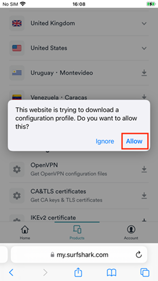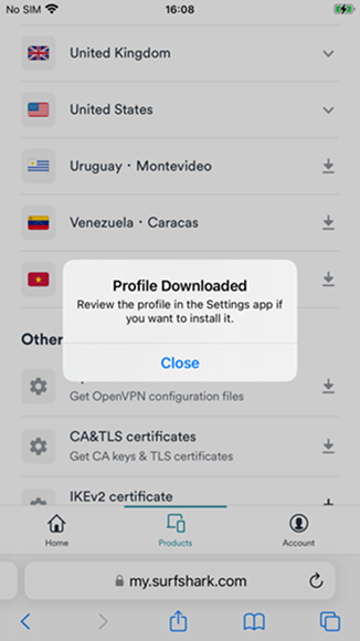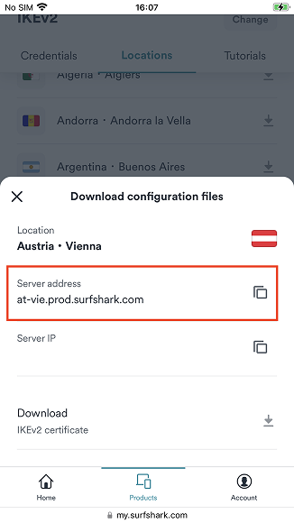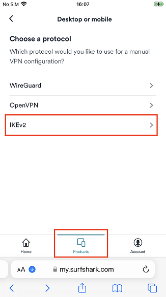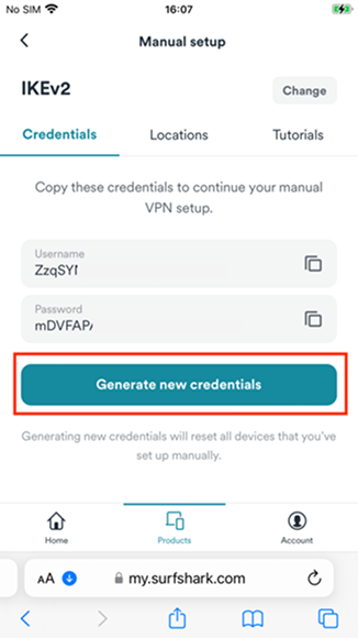 1. Download the IKEv2 certificate to your device and follow your VPN provider’s guide. For Surfshark, log in to your profile on our website, and then select Products > VPN > Manual Setup > Desktop or mobile > IKEv2 to generate your credentials.