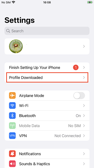 7. Open the Settings app and tap on the Profile Downloaded tab.