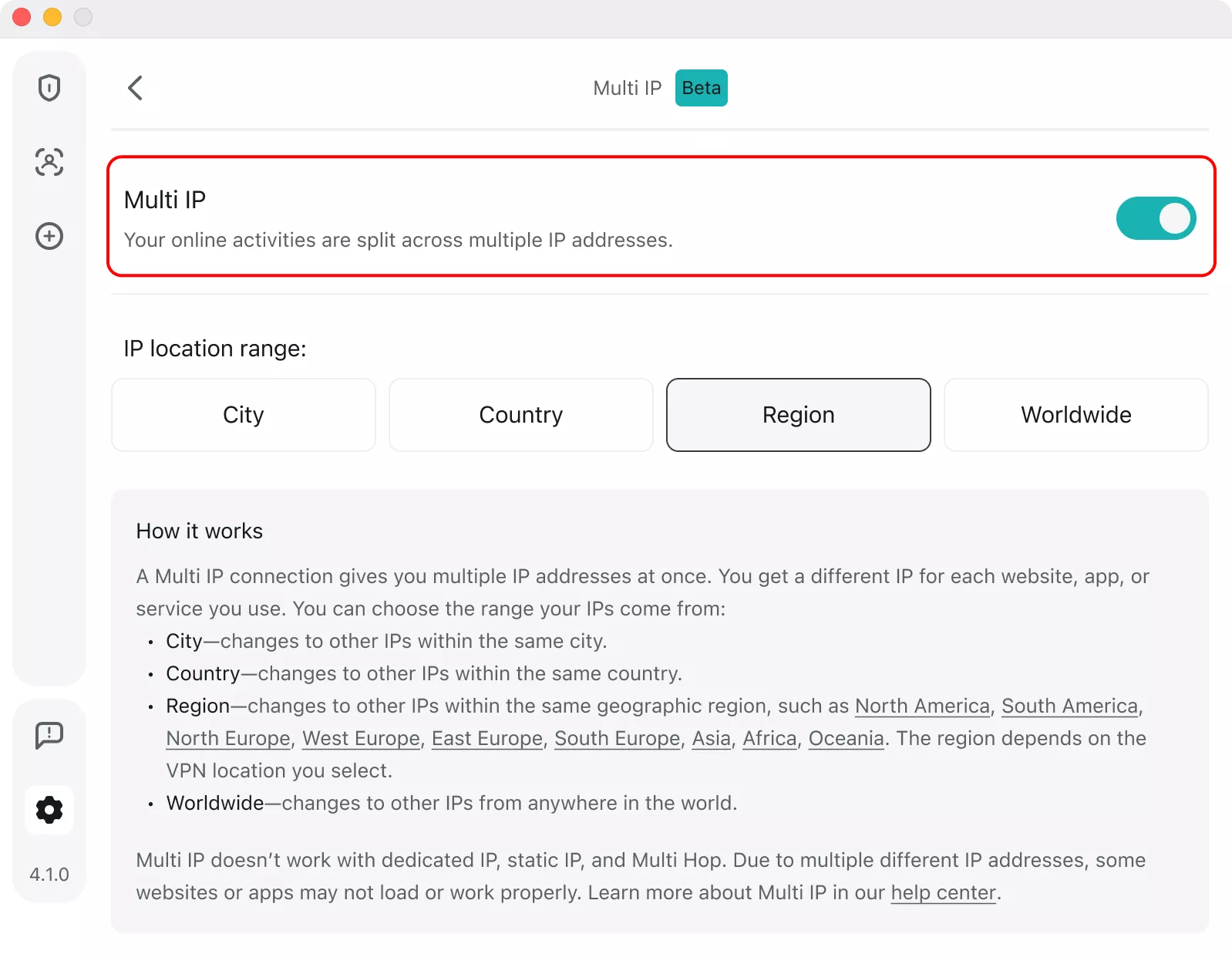 The features are intended for those requiring the utmost privacy. Selecting to rotate your IP globally with Multi IP or rotating IP may affect your internet experience, as some websites or apps might not work properly with a frequently changing IP.