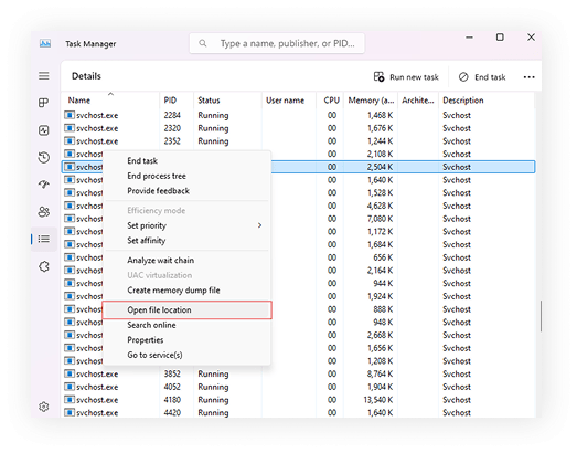 You can check if svchost.exe is infected by opening Task Manager, right-clicking the process, and selecting Open file location. If the file isn’t located in C:\Windows\System32 or consumes a lot of resources, it may be malware.