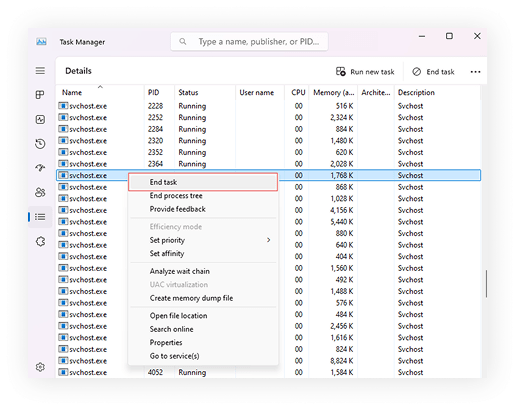 If that’s the case, go back to Task Manager, right-click on the svchost.exe process, and select End task. This will stop the malicious process from running.