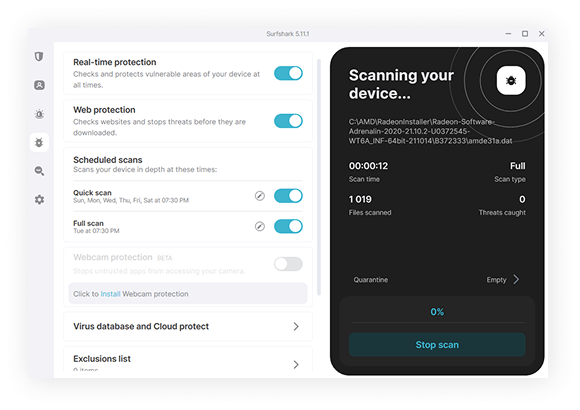 Now, open your antivirus software and run a full system scan (we recommend using Surfshark Antivirus — its malware database gets updated every three hours!). Your antivirus will identify and quarantine the threat while helping you keep your system secure in the future.