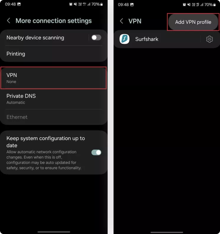 - Appuyez sur VPN puis sur Ajouter un VPN. Sélectionnez les trois points verticaux à droite et choisissez Ajouter un profil VPN.