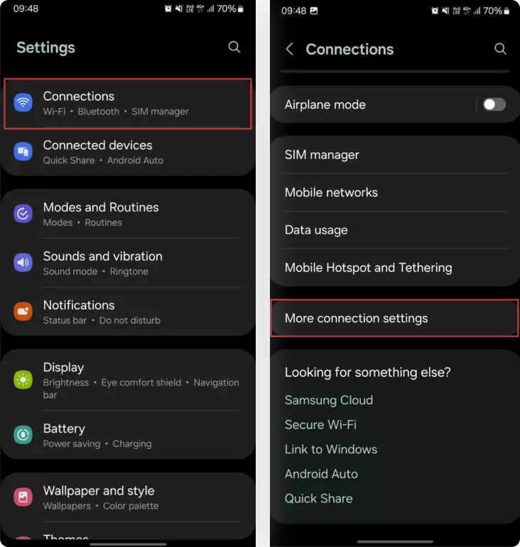 - Allez dans les Paramètres, appuyez sur Connexions, puis appuyez sur Plus de paramètres de connexion.
