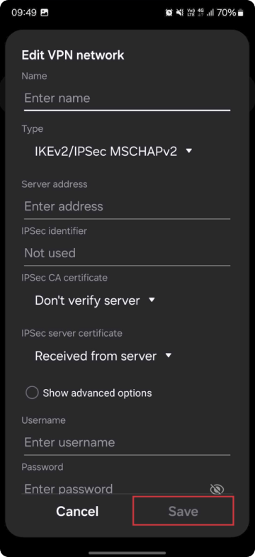 - Remplissez les champs Nom, Adresse du serveur, Nom d’utilisateur et les autres champs obligatoires de la fenêtre Modifier le réseau VPN sur l’écran Modifier le réseau VPN. Vous trouverez les informations relatives à votre serveur sur le site web de votre service VPN. Appuyez sur Enregistrer.