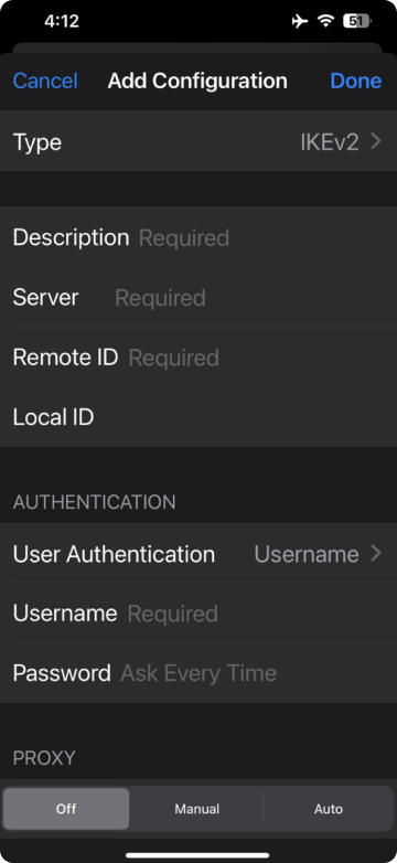 - Choisissez le type de VPN que vous souhaitez et remplissez les informations requises : Description, Serveur, Identifiant distant, Nom d’utilisateur et Mot de passe. Votre fournisseur de VPN vous communiquera les informations relatives à votre serveur. Renseignez les autres champs comme vous le souhaitez, puis appuyez sur Terminé.