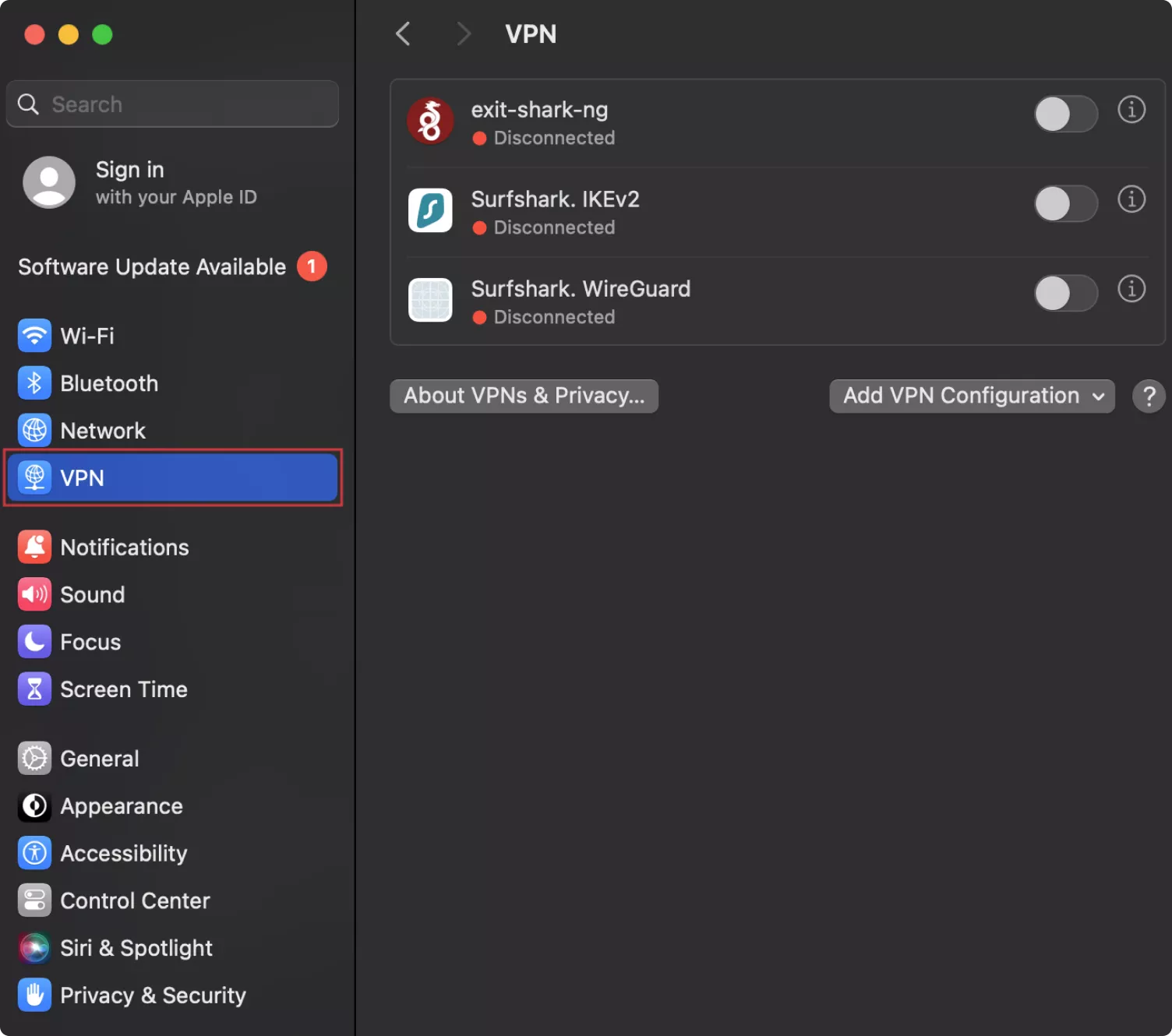 - Accédez à vos Réglages du système dans le menu Apple et cliquez sur VPN dans la barre latérale.