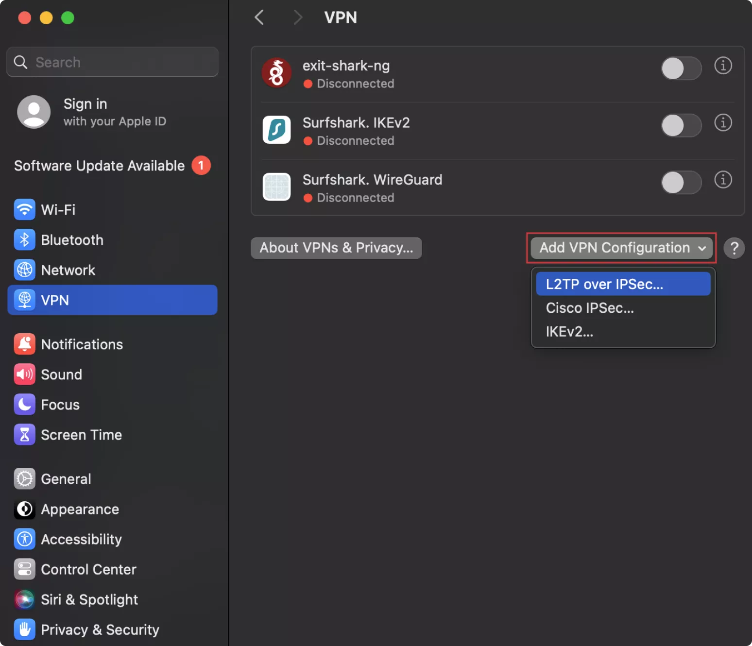 - Cliquez sur Ajouter une configuration VPN et choisissez la connexion VPN souhaitée.
