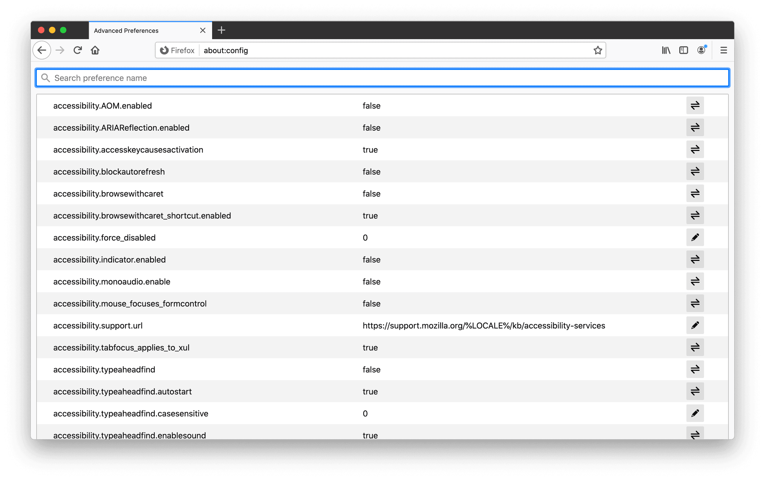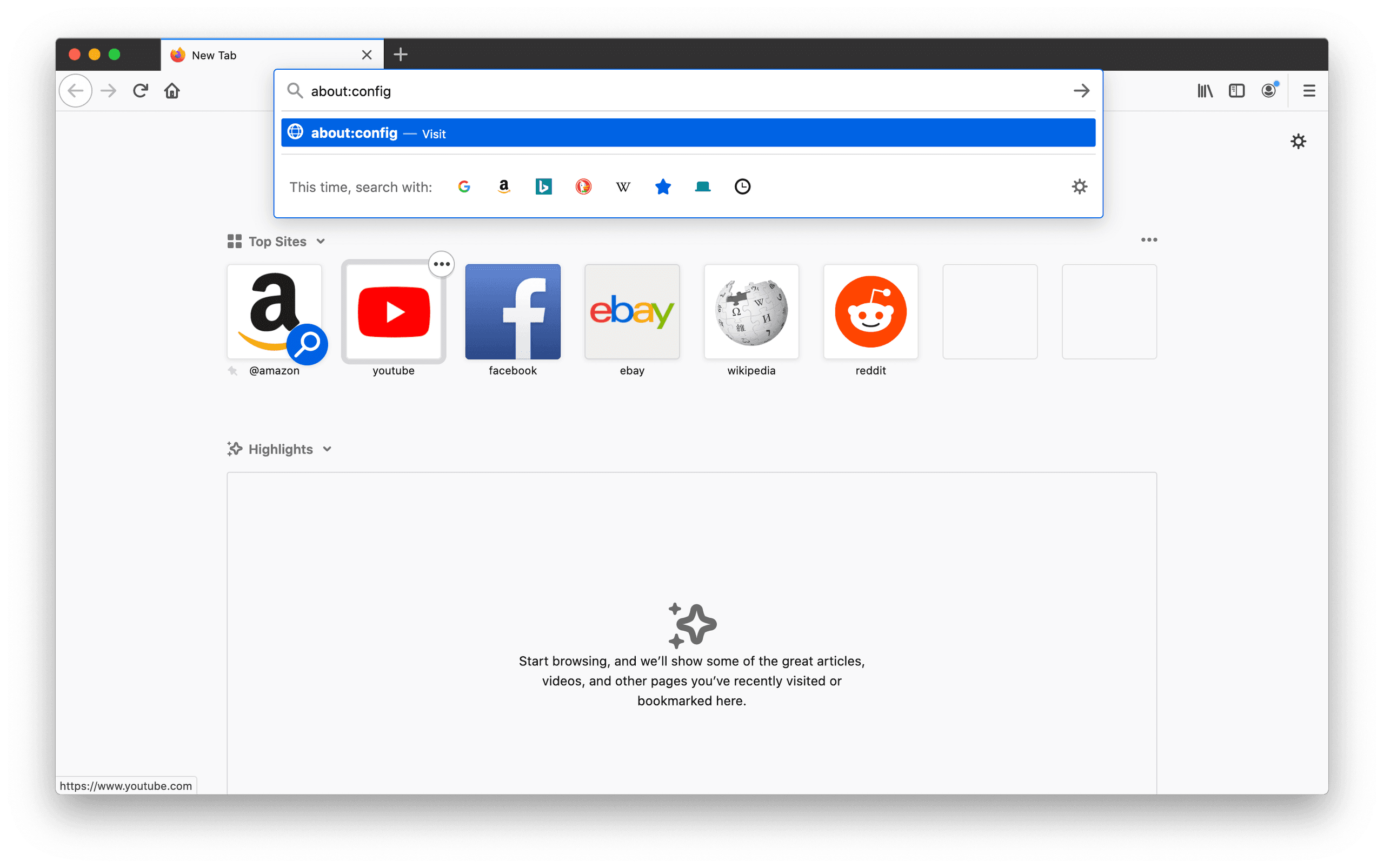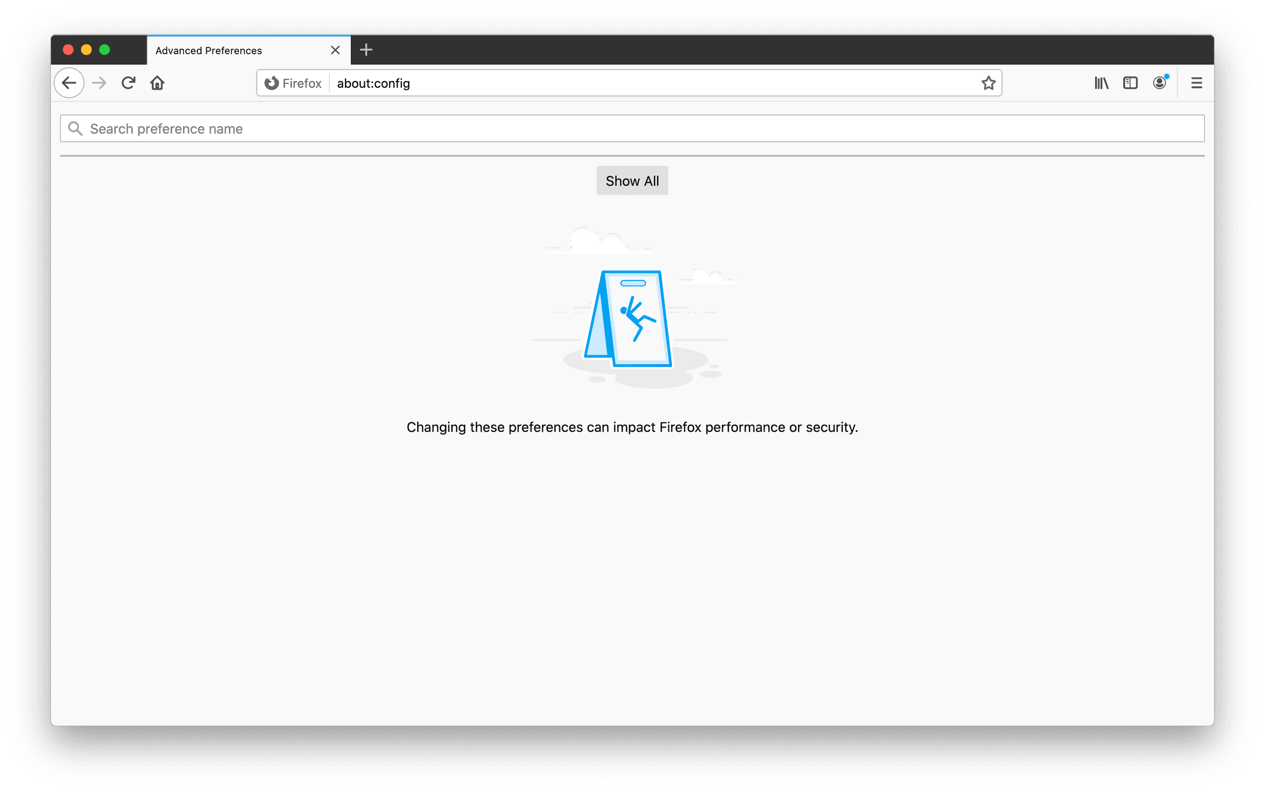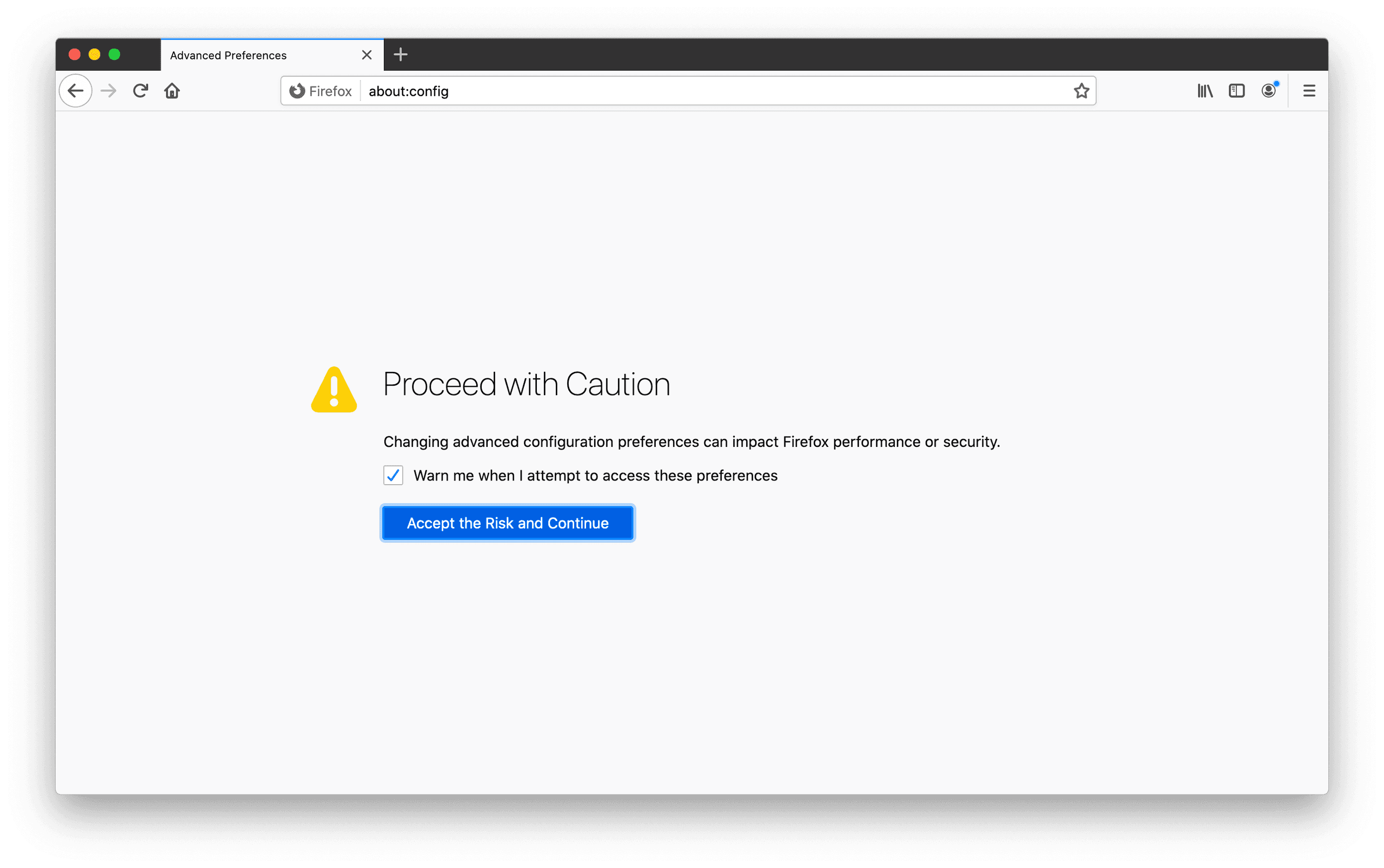 1. Type this in the URL bar and click Enter: about:config