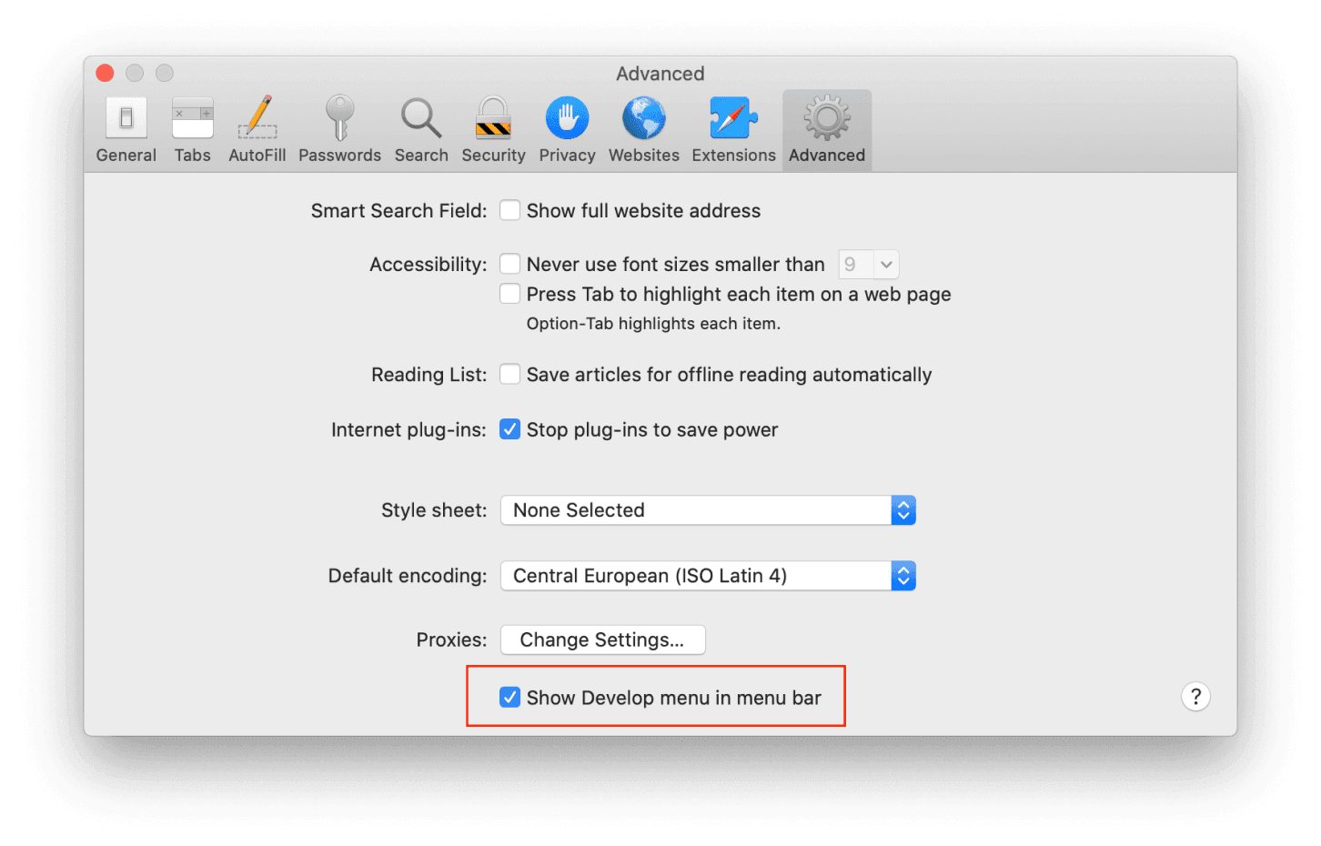 1. Go to Safari > Preferences. Check “Show Develop menu in menu bar”.